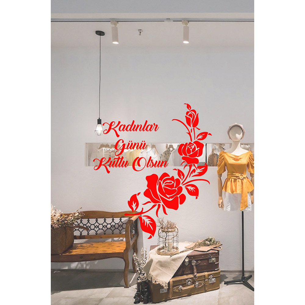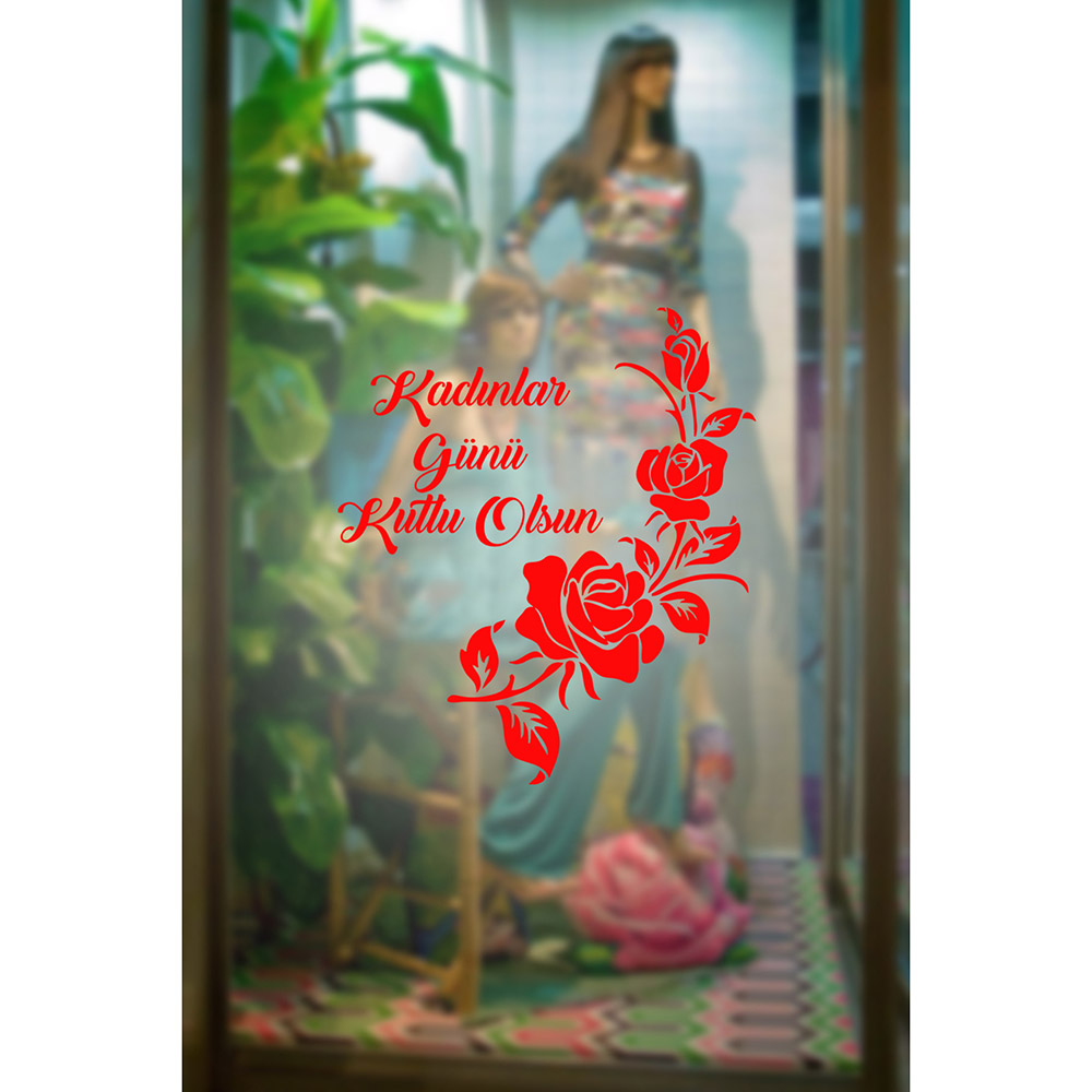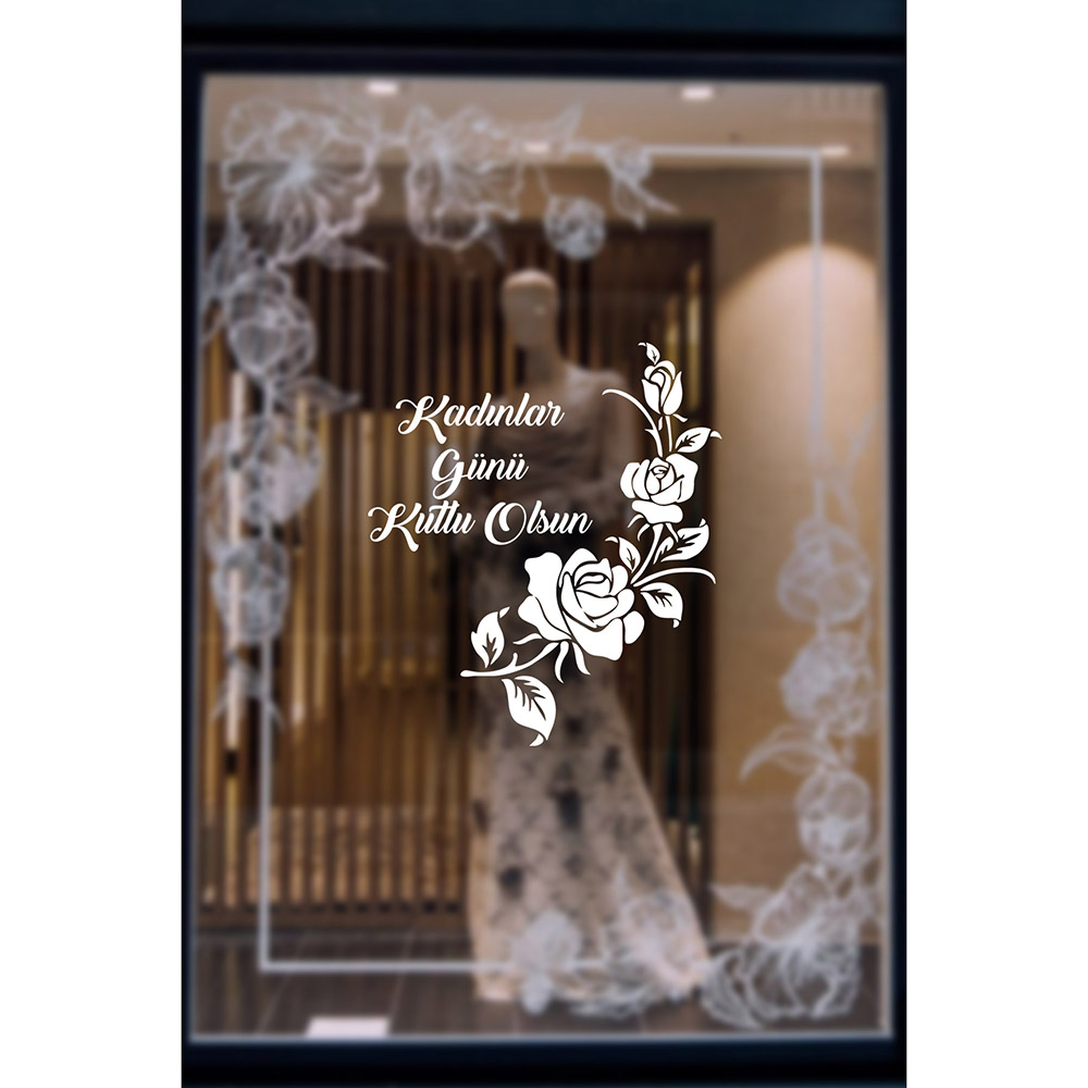 Zarif Güller ve 8 Mart Kadınlar Günü Kutlu Olsun Yazısı Cam Vitrin Stickerı 60cm