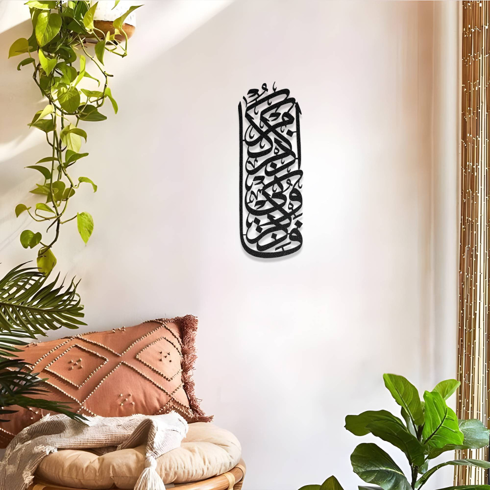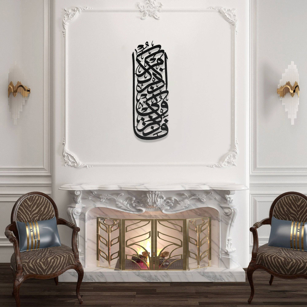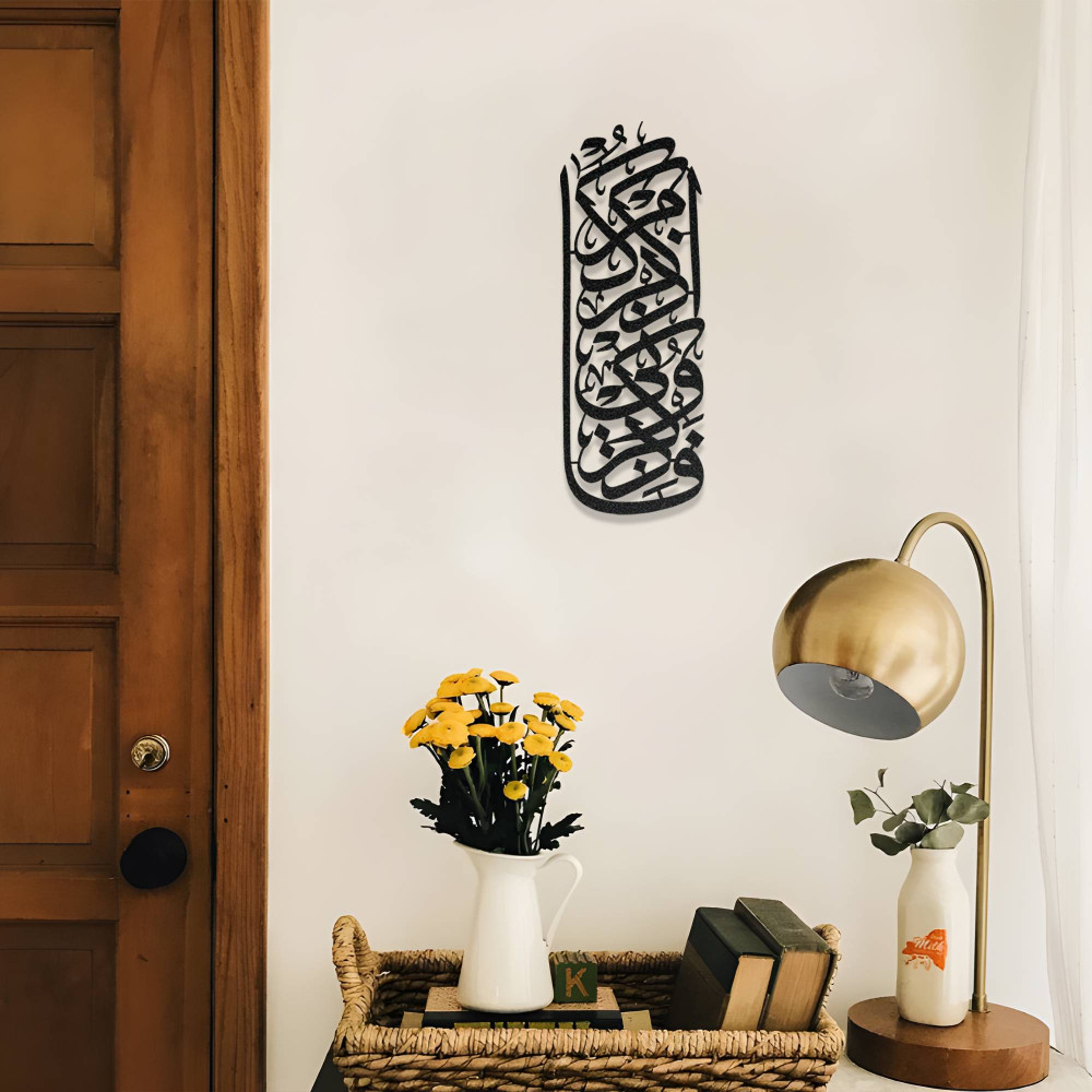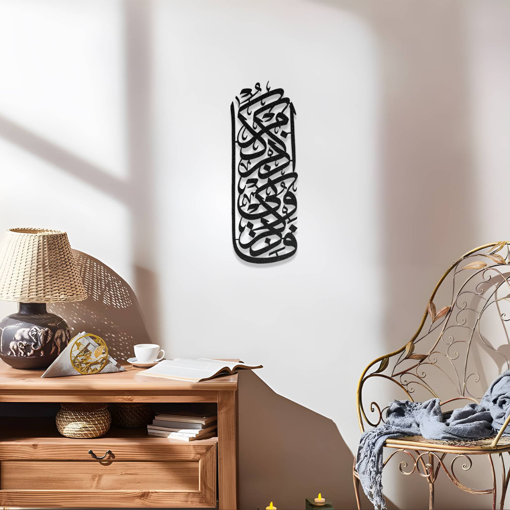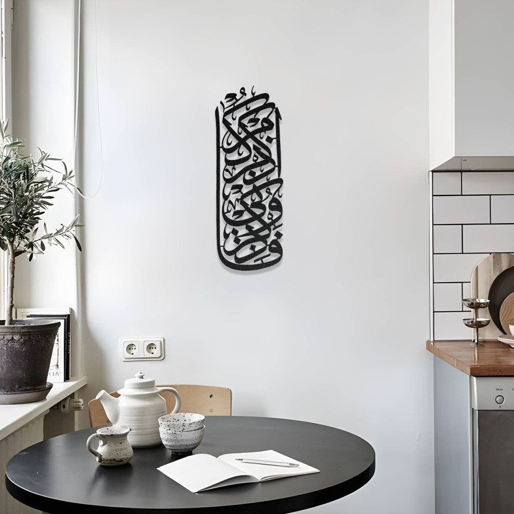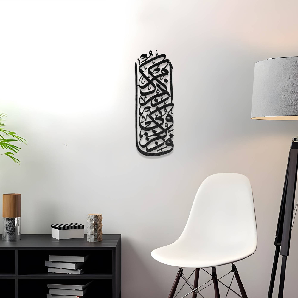 İslami hat sanatının zarif detaylarını modern dekorasyon ile birleştiren bu tasarım, bulunduğu mekâna hem manevi hem de sanatsal bir atmosfer kazandırır. Salon, antre, çalışma odası veya ibadet alanlarında kullanılabilecek anlamlı bir dekoratif parçadır.