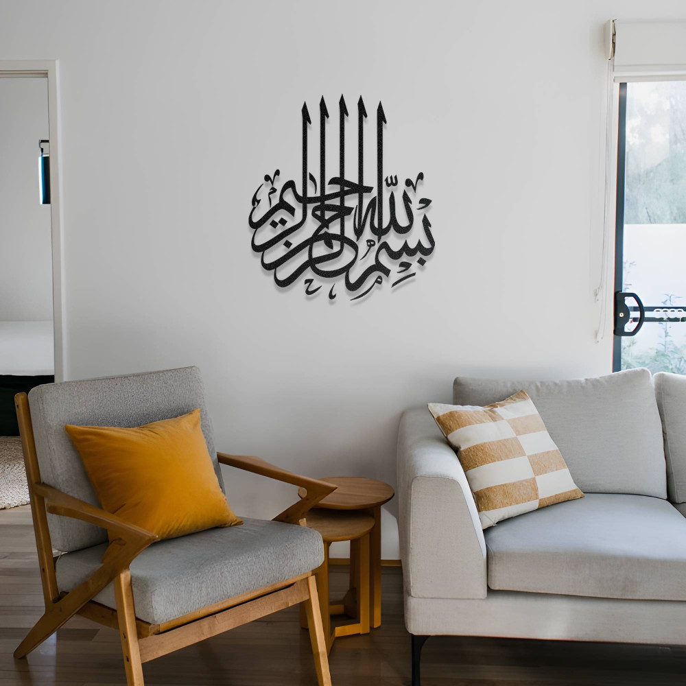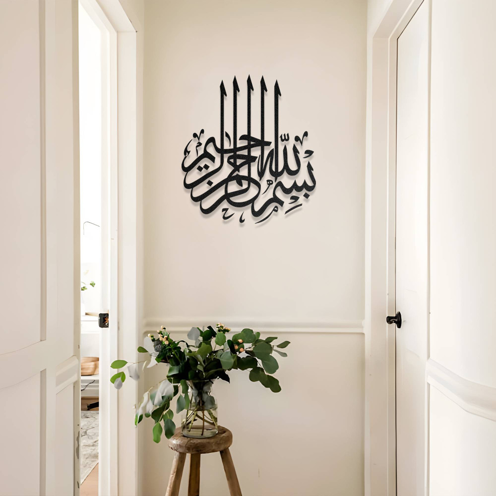 İslam kültüründe her hayırlı işin başlangıcını temsil eden “Bismillahirrahmanirrahim” (Besmele) ifadesi, bu özel tasarım metal duvar dekorunda zarif bir hat sanatı kompozisyonu ile sunulmuştur. Yukarı doğru yükselen hat çizgileri ve dengeli kaligrafi yapısı sayesinde hem güçlü hem de estetik bir görsel etki oluşturur.
