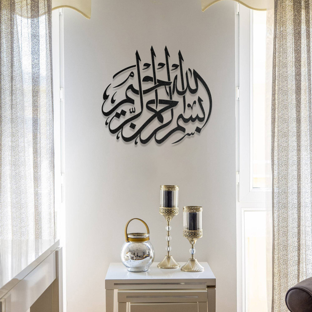 Bu özel tasarım metal duvar dekoru, İslam kültüründe önemli bir yere sahip olan “Bismillahirrahmanirrahim” (Besmele) ifadesini zarif bir hat sanatı kompozisyonu ile sunar. Yuvarlak ve dengeli kaligrafi formu, klasik İslami sanat estetiğini modern dekorasyon anlayışıyla bir araya getirir.