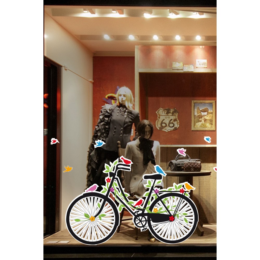 Bisiklet & Yeşil Renk Çiçekler Vitrin Tacı Mağaza Vitrin Cam Stickerı