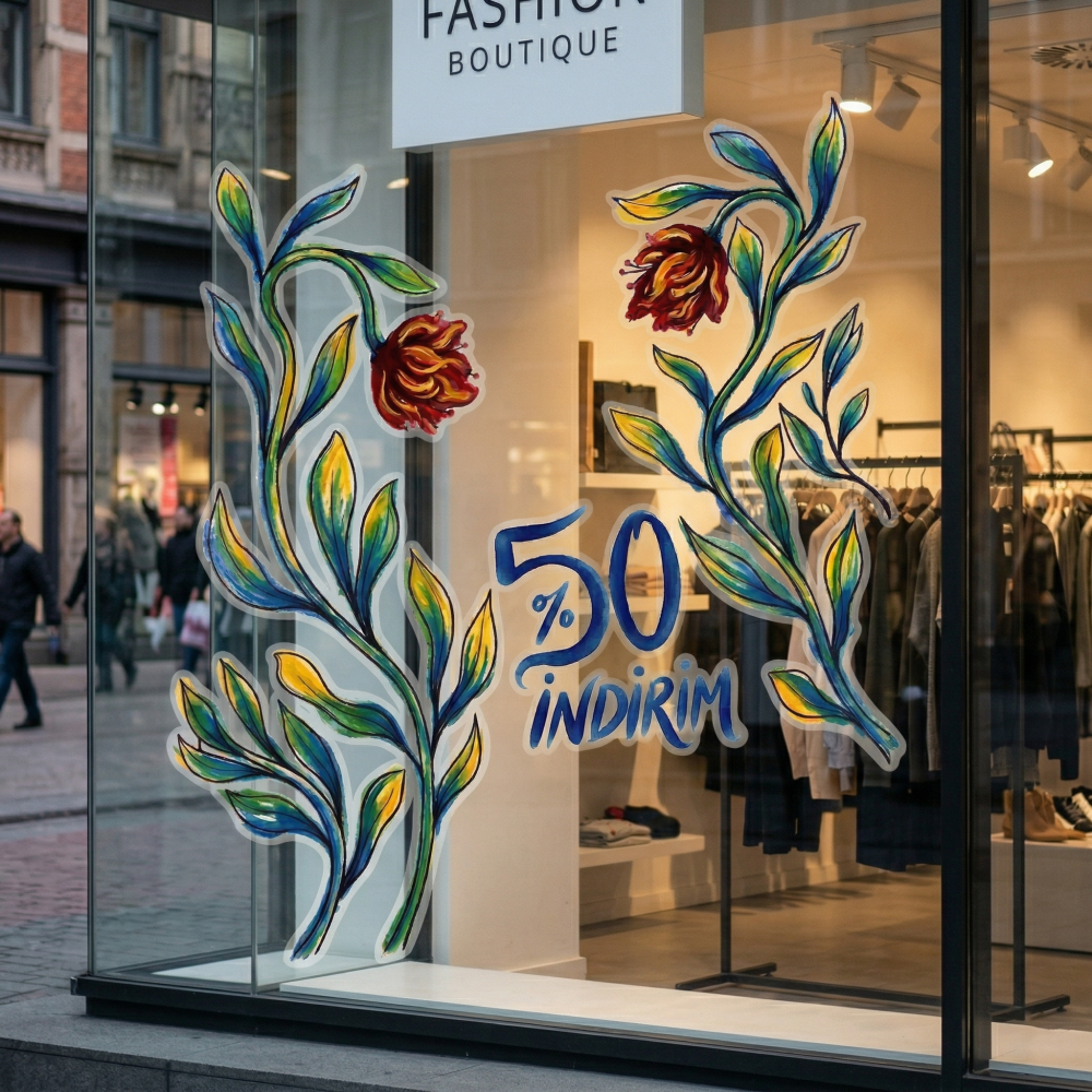 Çiçek Tasarım Vitrin Cam Sticker – %50 İndirim Yazısı & Dekoratif Cam Vitrin Sticker