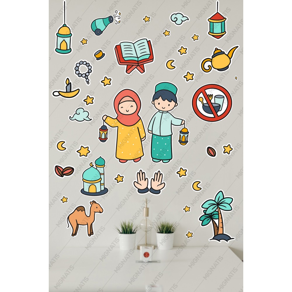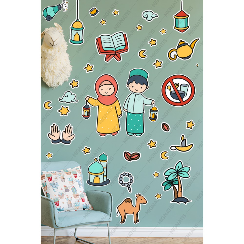 Elinde Fener Tutan Çocuklar Ramazan Sticker Seti - Ramazan Ayı Temalı Cam Duvar Süsleri Çocuk Odası